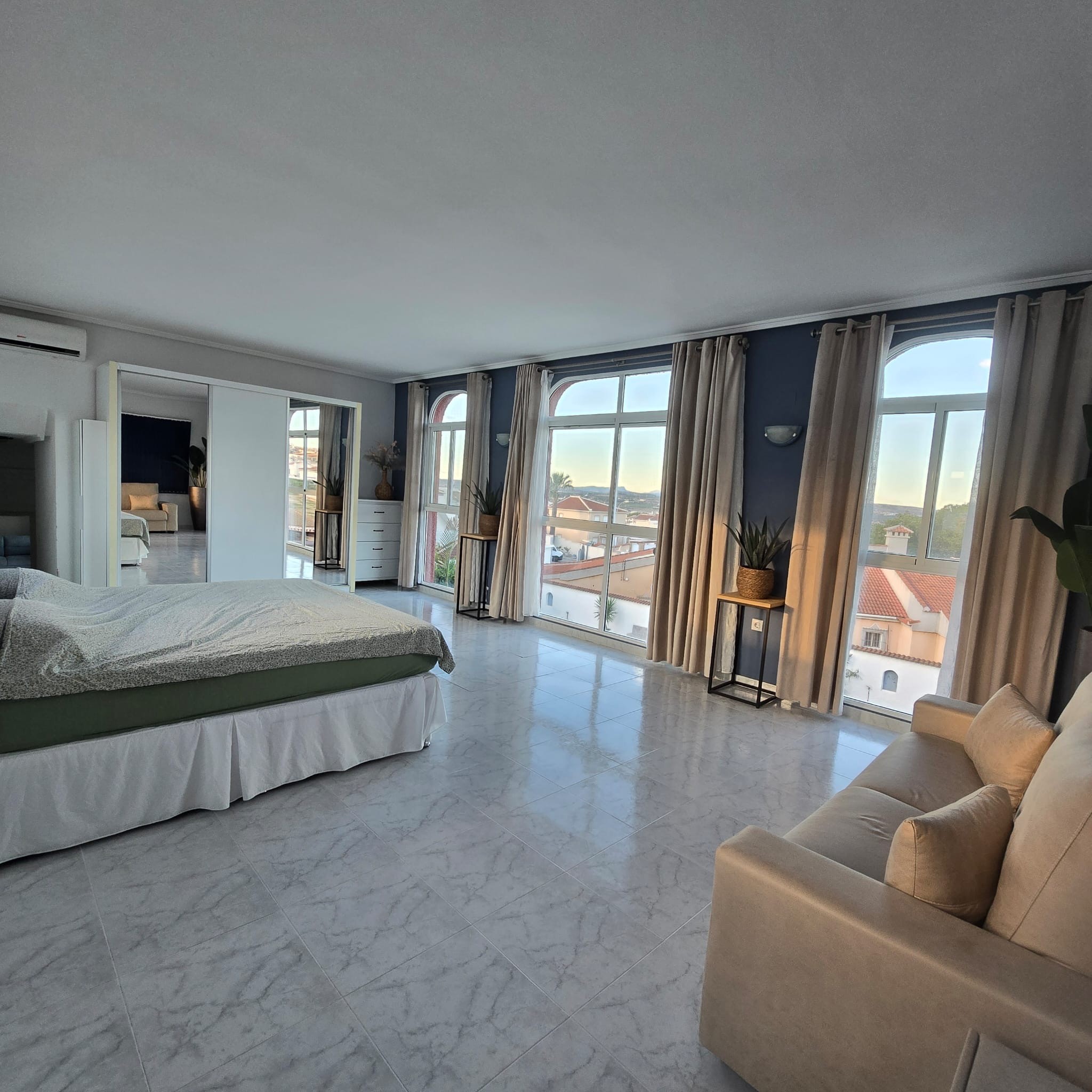 The master bedroom (bedroom 1) has large windows overlooking the sunset, ample wardrobe space, and a comfortable sofa bed for two additional guests. An ensuite bathroom includes a shower, toilet, and sink.